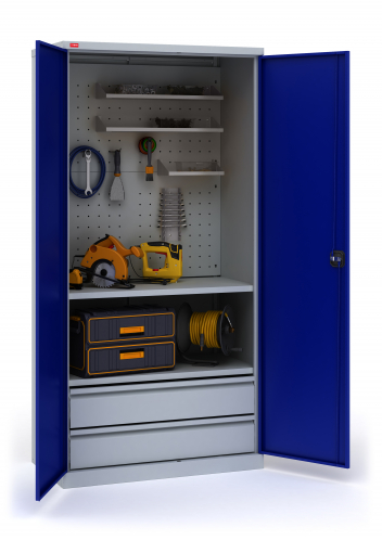Инструментальный шкаф ИП-1/1 односекционный предназначен для хранения инструментов, слесарных приспособлений и других изделий на предприятиях, в мастерских, гаражах, подсобных помещениях. Представляет собой сборно-разборную металлическую конструкцию, собираемую при помощью саморезов.