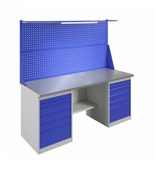 Максимальная распределенная нагрузка на двухтумбовый верстак - 2000 кг, на однотумбовый верстак - 1500 кг. Грузоподъемность ящиков тумб - 80 кг, полок тумб - 100 кг. Общая нагрузка на тумбу 500 кг