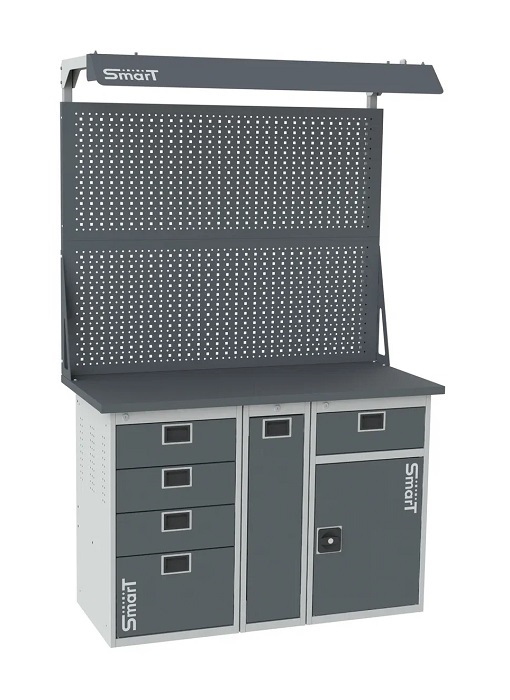 В комплектацию верстака входит: столешница 1280 SMART, тумба SMART 1-1, тумба SMART 4, тумба-пенал SMART, две перфорированные панели (экрана) SMART. Столешница выполнена из фанеры 27 мм со стальной окрашенной накладкой 1,2 мм. Тумба SMART 1-1 комплектуется одной дверью, одним выдвижным ящиком и одной полкой. Возможна смена стороны открывания двери тумбы. Внутренняя стенка двери имеет универсальную перфорацию для размещения навесных элементов. Тумба SMART 4 комплектуется 4 выдвижными ящиками. Выдвижные ящики оборудованы телескопической системой полного выдвижения ящиков с фиксацией в закрытом состоянии (50000 циклов). Тумба-пенал SMART выдвигается на четырех телескопических направляющих и предназначена для хранения крупногабаритных инструментов и аксессуаров. Все тумбы закрываются ключевым цилиндровым замком. Секретность замка 2000 комбинаций (2 ключа в комплекте). Перфорированный экран SMART имеет универсальную перфорацию для размещения различного типа крючков и держателей инструмента. Шаг квадратной перфорации (10 мм) - 38х38 мм, круглой (7 мм) - 25х38 мм. Цвет верстака: корпус тумб - серый Ral 7035, столешница, лицевая панель тумб, экран - графит Ral 7016. Поставляется в разобранном виде.