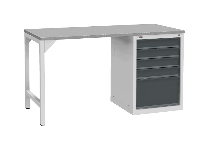 В комплектацию верстака входит: столешница ВЛ-К 150, одна опора ВЛ-К, косынки для опоры ВЛ-К, тумба ВЛ-К-015. Столешница выполнена из фанеры (24 мм) с покрытием из оцинкованного листа металла. Тумба ВЛ-К-015 комплектуется 5 выдвижными ящиками с телескопическими направляющими. Полезный размер ящиков (ВхШхГ): 1-280х459х459 мм, 4-80х459х459 мм. Тумба закрывается центральным ключевым замком (50 000 циклов). Опора сварная. Размер опоры (ВхШхГ) - 800х40х660 мм.