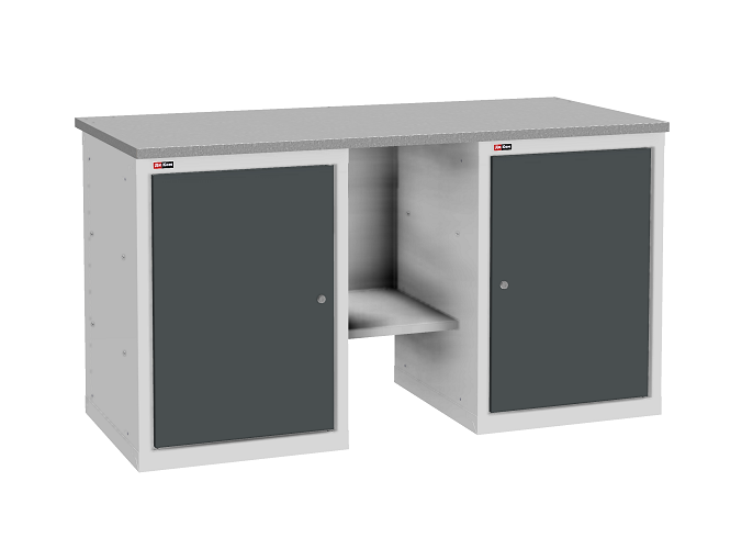 В комплектацию верстака входит: столешница ВЛ-К 150, полка и стенка ВЛ-К, две тумбы ВЛ-К-010. Столешница выполнена из фанеры (24 мм) с покрытием из оцинкованного листа металла. Тумба ВЛ-К-010 комплектуется двумя полками и дверью. Тумба закрывается центральным ключевым замком (50 000 циклов).