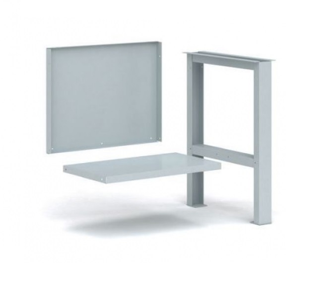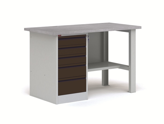 В комплект верстака ВП-3Т/1,2 входит: столешница СТ-1,2 из МДФ, покрытая оцинкованным листовым металлом, комплект К-2/1,2 (стенка задняя металлическая, металлическая верстачная опора), тумба Т-2Т с пятью выдвижными ящиками на телескопических направляющих. Тумба закрывается центральным ключевым замком. Тумбу можно установить как с левой, так и правой стороны верстака.