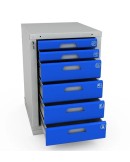Тумбы Woker 05 комплектуется 5 выдвижными ящиками. Полезные размеры ящика (ШхГ) 459х612 мм (высота - 2 ящика - 135 мм, 2 ящика 65 мм, 1 ящик 275 мм). Ящики имеют противоскользящие коврики и набор наклеек с пиктограммами для маркировки содержимого ящика. Закрывается на цилиндрический замок, секретность замка 2000 комбинаций.