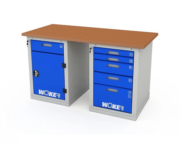 В комплектацию верстака входит: столешница Woker 1500, одна тумба Woker 02, одна тумба Woker 05. Столешница выполнена из шлифованной березовой многослойной фанеры толщиной 30 мм. Снаружи фанера обработана влагостойким антисептиком цвета "красное дерево", что придает фанере повышенную влагостойкость и более темный цвет. Тумба Woker 02 имеет одну регулируемую по высоте полку (шаг 50 мм). Полка тумбы установлены на стальные салазки, которые позволяют выдвигать полку на себя на 70% для облегчения разгрузки/погрузки. Дверь тумбы закрывается на цилиндрический замок со стальной поворотной ручкой, секретность замка 2000 комбинаций. Открывание двери на 180 градусов. Тумба Woker 05 комплектуется 5 выдвижными ящиками (2 высотой - 135 мм, 2 высотой - 65 и 1 высотой - 275 мм). Полезный размер ящика: (ШхГ) 459х612 мм. В ящиках есть противоскользящие коврики и набор наклеек с пиктограммами для маркировки содержимого.